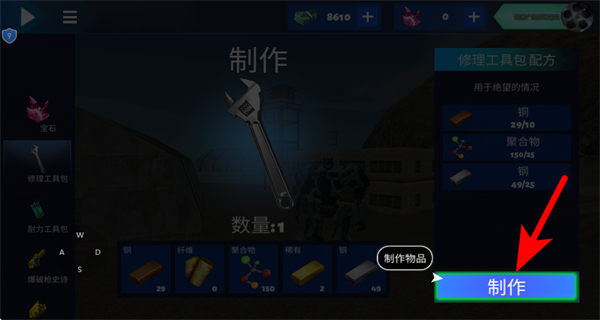 4、在制作面板中,選擇目標(biāo)道具,確認(rèn)材料數(shù)量滿足配方要求后,點(diǎn)擊制作按鈕完成道具的制作。