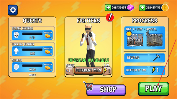 1、在該界面點擊右下角的PLAY按鈕,進入DAY1:CITY-APOCAL的對戰(zhàn)環(huán)節(jié),己方角色為DIFFERENTMAN等級1,同時可查看任務及進度。