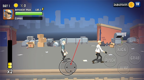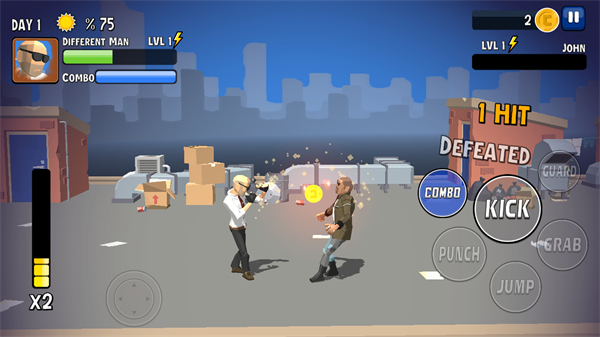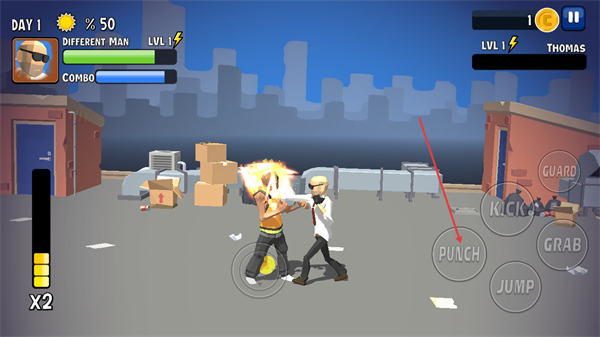 3、在DAY1的對戰(zhàn)過程中,點擊右側(cè)的PUNCH按鈕對對手發(fā)起攻擊,積累COMBO的同時推進進度至50%,持續(xù)消耗對手血量。