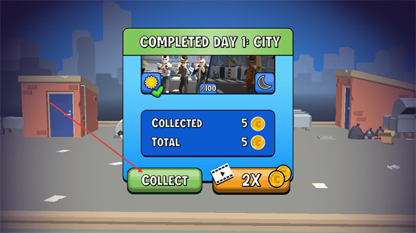 4、完成DAY1的對戰(zhàn)后出現(xiàn)COMPLETEDDAY1:CITY的提示,點擊界面中的COLLECT按鈕,即可領取對應的5個金幣獎勵。