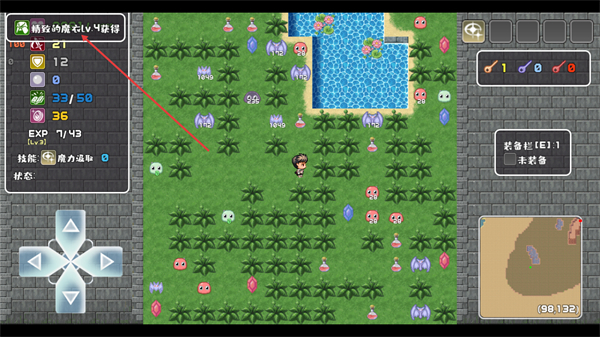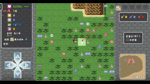 3、進入迷宮場景后,用方向鍵操控角色移動,靠近并拾取場景中的藥水道具,同時注意周圍出現(xiàn)的怪物。