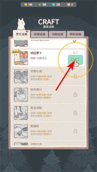 3、跟隨紅色箭頭提示,點(diǎn)擊切紅蘿卜對應(yīng)的金幣按鈕,消耗資源解鎖該烹飪設(shè)施,拓展烹飪功能。
