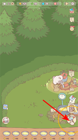 1、進(jìn)入游戲主場(chǎng)景后,點(diǎn)擊紅色箭頭指向的烹飪產(chǎn)物區(qū)域,收取當(dāng)前制作的食物資源,這是積累游戲貨幣操作。