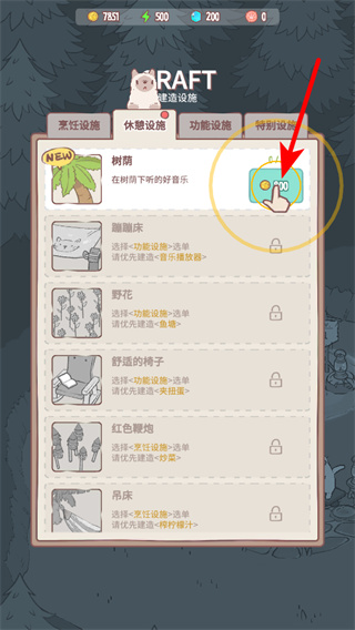 2、在建造界面中,依照紅色箭頭指引,點(diǎn)擊樹椅對(duì)應(yīng)的金幣按鈕,消耗資源解鎖該休憩設(shè)施,拓展場(chǎng)景功能。