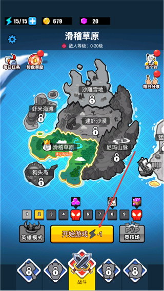 1、進(jìn)入滑稽草原界面后,點(diǎn)擊開(kāi)始游戲按鈕即可進(jìn)入對(duì)應(yīng)區(qū)域的游戲關(guān)卡,同時(shí)還能通過(guò)英雄模式、競(jìng)技場(chǎng)等入口參與其他玩法。