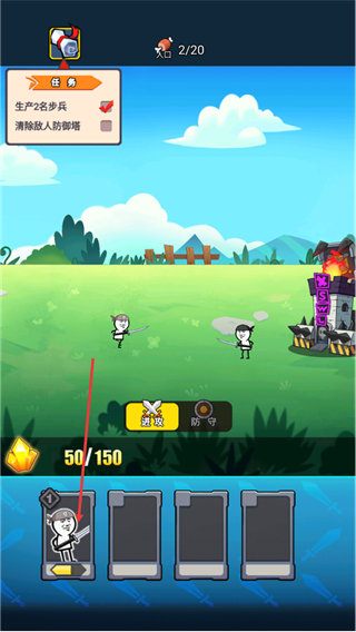 2、在當(dāng)前界面中,需完成生產(chǎn)2名步兵和清除敵人防御塔的任務(wù),點(diǎn)擊下方的步兵單位可將其派出,派出后單位會(huì)自動(dòng)向敵方防御塔移動(dòng)并發(fā)起攻擊。