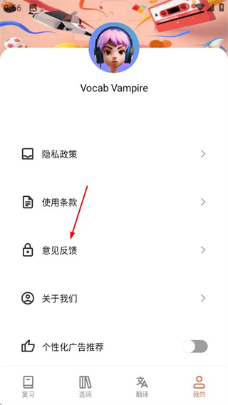 2、在個(gè)人中心頁面,點(diǎn)擊意見反饋選項(xiàng),可進(jìn)入意見反饋頁面。
