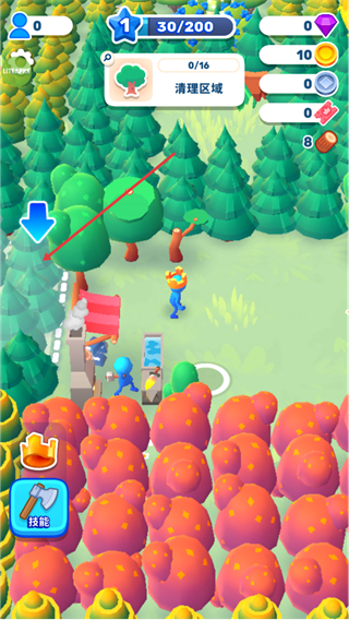 4、根據(jù)界面提示執(zhí)行清理區(qū)域的任務(wù),操控角色清理區(qū)域內(nèi)的樹木,可借助技能提升效率,完成后推進(jìn)后續(xù)流程。