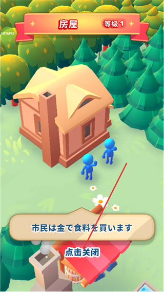 1、看到房屋等級1的提示后,了解成為國王后的規(guī)則,點擊關閉按鈕關閉提示,繼續(xù)推進游戲進程。