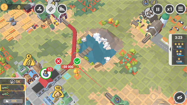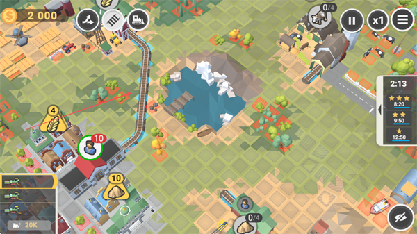 2、規(guī)劃軌道連接資源點,避開紅色叉號區(qū)域,確認(rèn)軌道后點擊綠色對勾,推進(jìn)列車運輸。