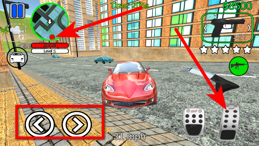 3、用右側(cè)踏板控制車速,操作左側(cè)方向鍵控制車輛轉(zhuǎn)向,按指引前往目標(biāo)點(diǎn)。
