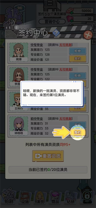 2、在簽約中心選擇資質(zhì)達(dá)標(biāo)的演員,完成藝人簽約,擴(kuò)充公司的演員陣容。
