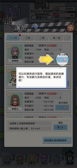 3、進(jìn)入演員界面,消耗資源對(duì)藝人進(jìn)行指導(dǎo),提升演員的專(zhuān)業(yè)能力等屬性。