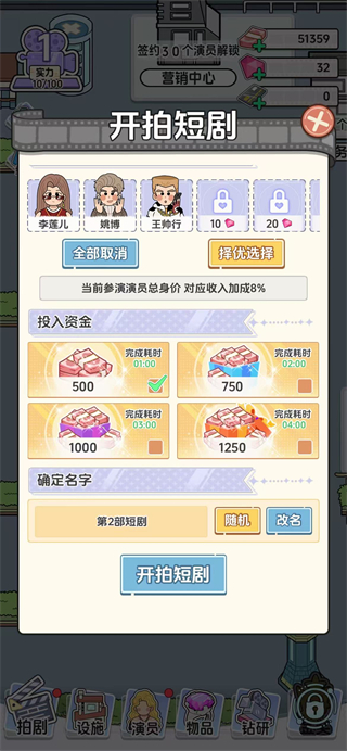 4、進(jìn)入開(kāi)拍短劇界面,選擇演員和資金,點(diǎn)擊開(kāi)拍短劇,產(chǎn)出短劇獲取收益。