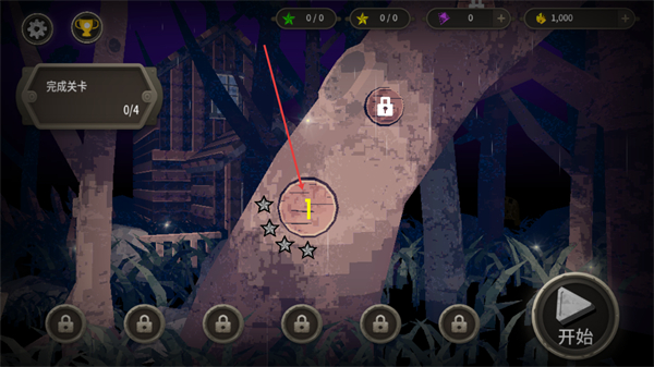 1、在關(guān)卡選擇界面,當(dāng)前完成關(guān)卡0/4,點(diǎn)擊標(biāo)有1的關(guān)卡區(qū)域后,再點(diǎn)擊右下角的開(kāi)始按鈕進(jìn)入該關(guān)卡。
