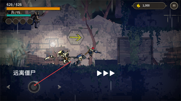 2、進(jìn)入關(guān)卡后,按提示遠(yuǎn)離僵尸,通過(guò)左下角的移動(dòng)控制區(qū)域操作角色,跟隨黃色箭頭指引的方向移動(dòng)。
