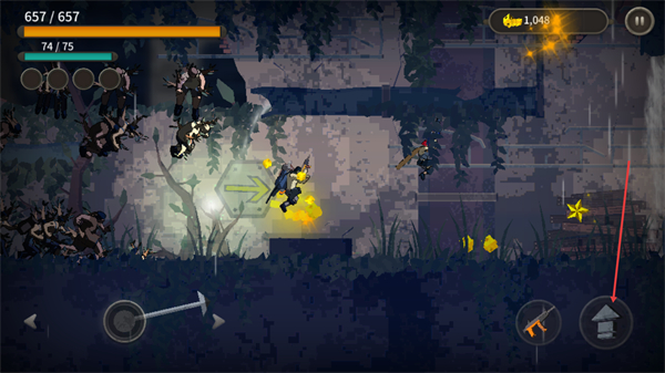 3、在關(guān)卡推進(jìn)過(guò)程中,可使用界面右側(cè)的跳躍按鈕跳過(guò)高臺(tái)躲避僵尸,同時(shí)跟隨黃色箭頭方向前進(jìn),收集場(chǎng)景內(nèi)的道具資源。