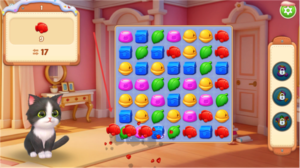 2、多重玩法深度融合,以經(jīng)典三消為核心,串聯(lián)家園建造與萌寵養(yǎng)成玩法,消除闖關(guān)獲取的資源可用于裝修房屋、解鎖貓咪互動道具,玩法環(huán)環(huán)相扣不單調(diào)。