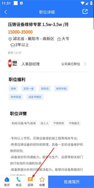 3、在職位詳細(xì)頁(yè)面確認(rèn)信息后,點(diǎn)擊直聊按鈕進(jìn)行在線(xiàn)直聊。