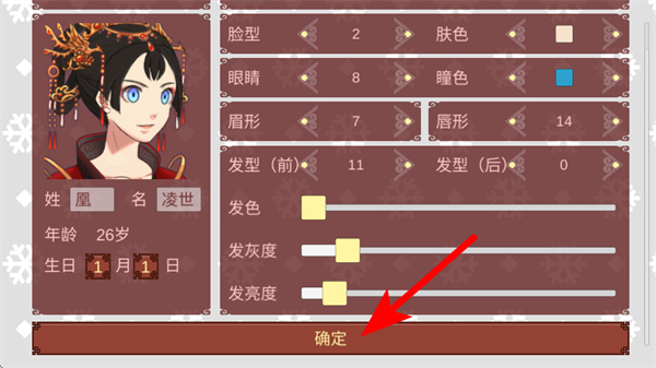 1、進(jìn)入角色創(chuàng)建界面后,完成臉型、發(fā)色等外觀設(shè)置,點(diǎn)擊紅色箭頭指向的確定按鈕,確認(rèn)角色形象并進(jìn)入游戲主界面。