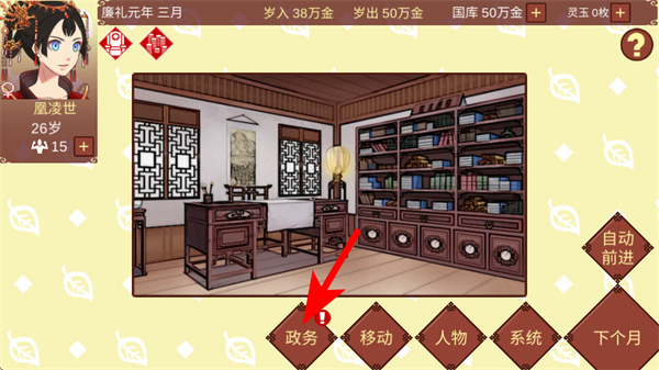 2、在主界面中,依照紅色箭頭指引,點(diǎn)擊政務(wù)按鈕,進(jìn)入官員管理與朝政處理的核心功能界面,推進(jìn)游戲的經(jīng)營(yíng)流程。
