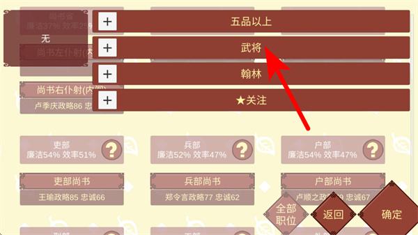 3、緊跟紅色箭頭指引,選擇目標(biāo)職位如尚書左仆射,查看該職位的官員屬性廉潔、效率等,為官職任免做準(zhǔn)備。