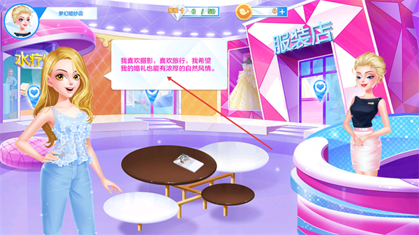 2、進入夢幻婚紗店場景后,接收顧客提出的我喜歡攝影,喜歡旅行,我希望我的婚禮也能有濃厚的自然風情的需求,記錄其婚禮風格偏好。