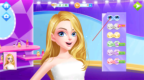 3、處于美妝環(huán)節(jié)時,選擇右側(cè)美瞳欄中的對應(yīng)款式,完成眼部裝扮調(diào)整,推進當前美妝任務(wù)的進度。