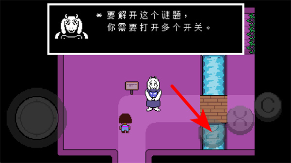 1、根據(jù)提示,解開謎題需打開多個開關(guān),先操控角色移動到箭頭指向的機(jī)關(guān)處,觸發(fā)該開關(guān)推進(jìn)解謎流程。