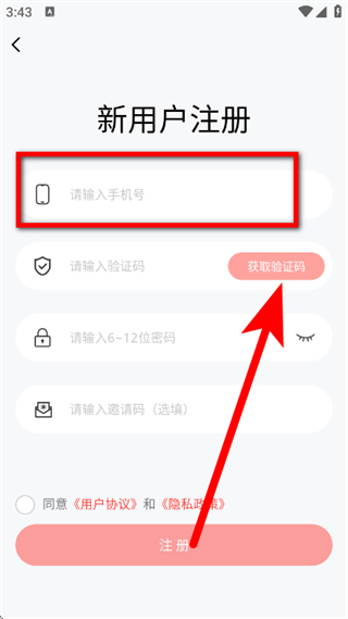3、在新用戶注冊頁面,輸入手機(jī)號,點擊獲取驗證碼。