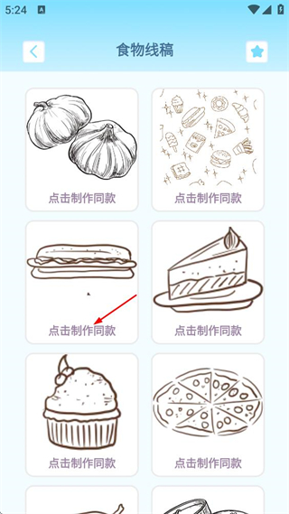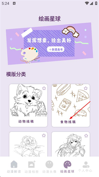 2、在繪畫星球頁面,點擊食物線稿模板分類,進入食物線稿模板列表。