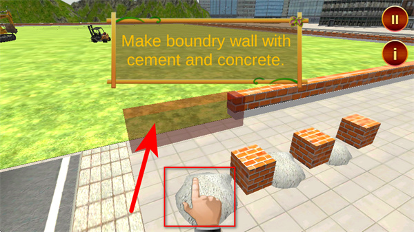 2、游戲中依照箭頭指引點擊石塊,按提示用水泥和混凝土搭建圍墻,需精準操作對應材料來推進建造進度。