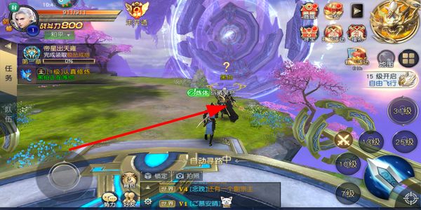 2、玩家在主界面開啟自動尋路功能,跟隨劇情任務(wù)指引移動到目標NPC處,推進主線劇情的流程。