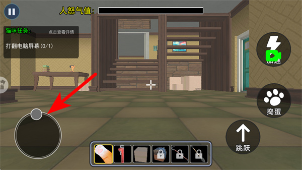 4、按箭頭指引點(diǎn)擊右側(cè)的搗蛋按鈕,觸發(fā)貓咪的互動(dòng)操作,完成打翻電腦屏幕等任務(wù)目標(biāo),提升游戲進(jìn)程。