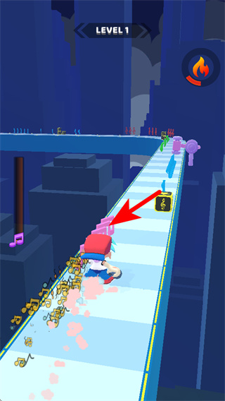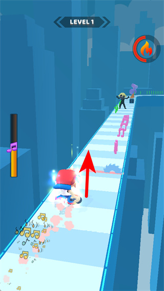 3、緊跟紅色箭頭指引,躲避路徑上的障礙元素,同時(shí)收集更多音符提升關(guān)卡得分,確保角色平穩(wěn)推進(jìn)跑酷流程。