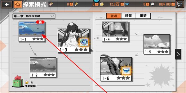 1、探索模式界面選擇對(duì)應(yīng)的章節(jié)關(guān)卡,點(diǎn)擊關(guān)卡入口進(jìn)入戰(zhàn)斗場(chǎng)景,開啟當(dāng)前關(guān)卡的挑戰(zhàn)流程。