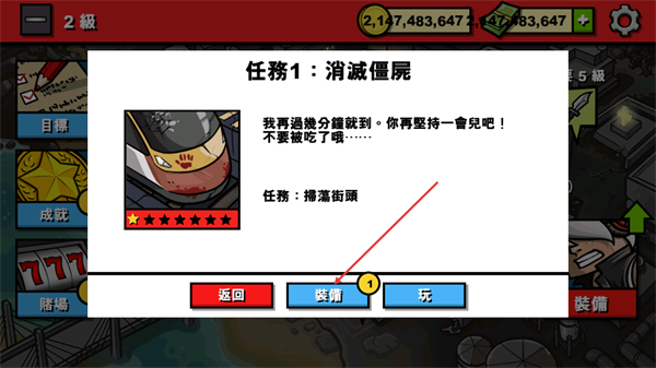 2、查看任務(wù)1掃蕩僵尸的掃蕩街頭目標(biāo),點(diǎn)擊裝備按鈕配置道具后,即可進(jìn)入任務(wù)環(huán)節(jié)。