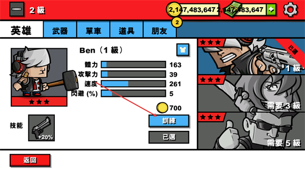 3、在裝備界面查看英雄Ben的屬性,消耗對(duì)應(yīng)資源點(diǎn)擊訓(xùn)練按鈕,提升其戰(zhàn)力屬性以增強(qiáng)任務(wù)作戰(zhàn)能力。