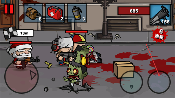 4、在戰(zhàn)斗場(chǎng)景中點(diǎn)擊右下角按鈕擊敗僵尸積累連殺次數(shù),同時(shí)利用上方道具欄物品輔助戰(zhàn)斗,向終點(diǎn)方向推進(jìn)完成任務(wù)。