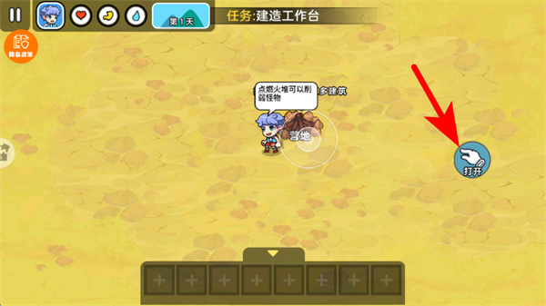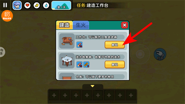 3、緊跟紅色箭頭指引,點(diǎn)擊打開(kāi)按鈕進(jìn)入建造界面,解鎖生存所需的工具與設(shè)施選項(xiàng),游玩推進(jìn)任務(wù)進(jìn)度。