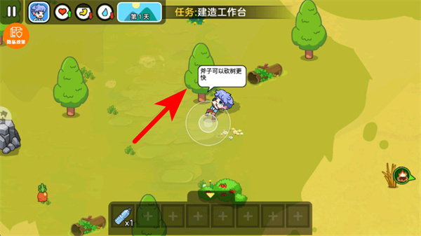 2、游戲中依照箭頭指引,靠近樹(shù)木區(qū)域收集木材資源,朝著建造工作臺(tái)的任務(wù)目標(biāo)前進(jìn),注意跟隨劇情資源收集點(diǎn)。