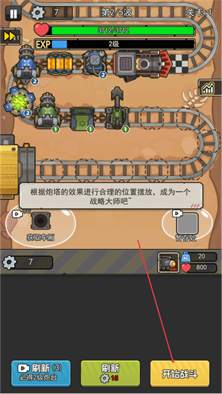 1、在第2波戰(zhàn)前,擺放炮塔到合理位置,點(diǎn)擊開(kāi)始戰(zhàn)斗,準(zhǔn)備迎敵。