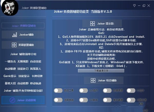 Joker英雄聯(lián)盟輔助是一款全新的強(qiáng)大英雄聯(lián)盟游戲輔助插件,玩家下載安裝后可即以使用無(wú)線視距、技能補(bǔ)刀、自動(dòng)閃避以及gank提示甚至是卡牌切牌等等功能應(yīng)有盡有,沖分王者不再是夢(mèng),下方有詳細(xì)說(shuō)明,擼友必備,歡迎下載!