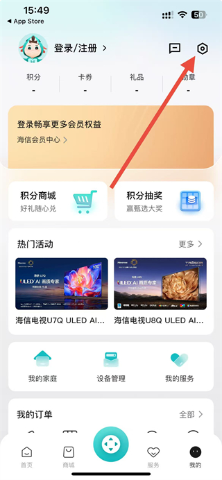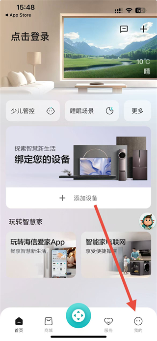 1.打開海信愛家App,點(diǎn)擊底部導(dǎo)航欄中間類似遙控器的圖標(biāo)。
